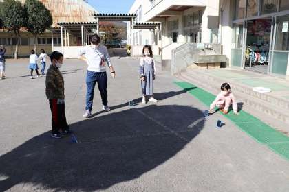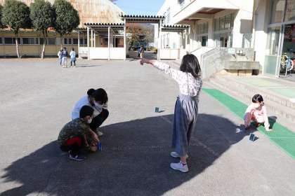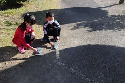 『光のせいしつ』はね返した日光は,どのように進むのだろうか。校庭でたしかめています。光の道すじが見えています。