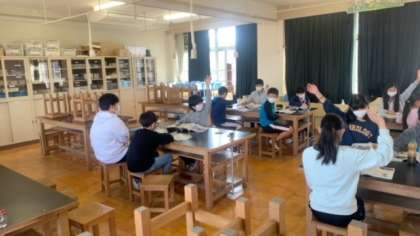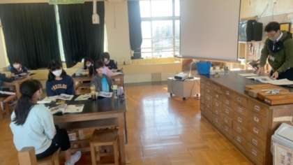 化石について学習をしています。理科の特別授業中です。6年生らしく積極的に発言もしています。