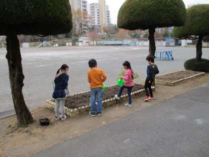 走った後は、チューリップにお水をあげます。