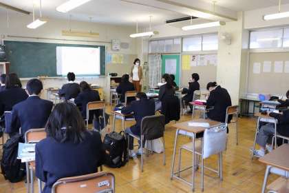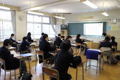 スクリーンに英文を写して学習しています。