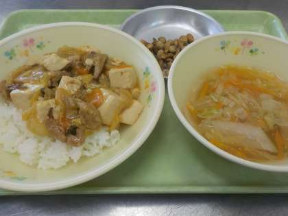 本日の献立:ごはん、豆腐のうま煮、春雨スープ、豆ナッツ黒糖