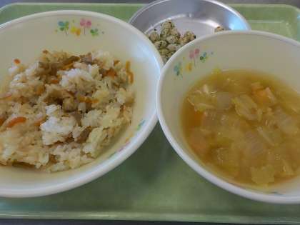 本日の献立:とりごぼうピラフ、ABCスープ、ポップビーンズ