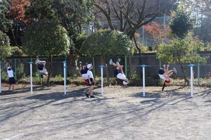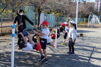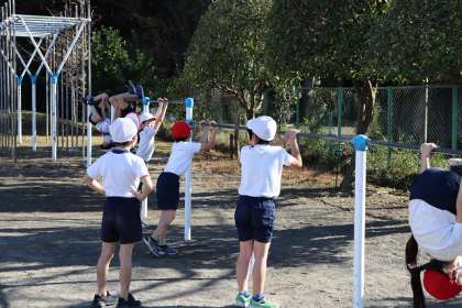 鉄棒の技に挑戦しています。「できたよ!」の声続出。