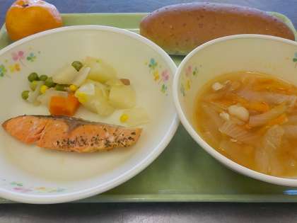本日の献立:セサミパン、鮭のレモン風味、ピッティパンナ、豆のスープ、みかん