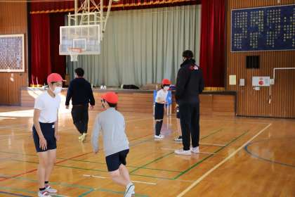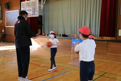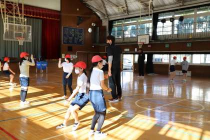 2校時は、6年生のバスケットボール教室です。体をほぐしていきます。