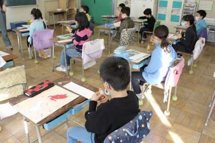 「お話びじゅつかん」を作ろう。「お話びじゅつかん」の作品が出来上がりました。これから掲示できるように名札を貼ります。