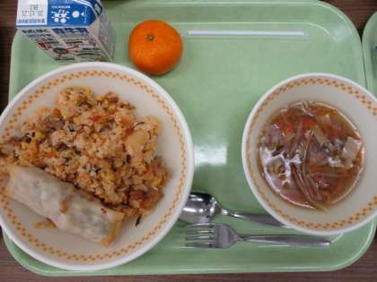 今日の献立:キムチチャーハン、棒餃子、もやしスープ、みかん