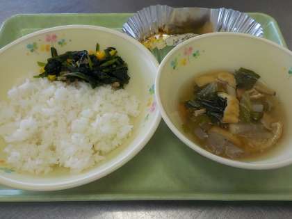 本日の献立:ごはん、白身魚のマヨネーズ焼き、胡麻汁、青菜とコーン炒め