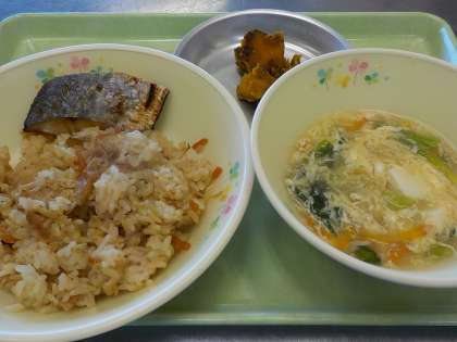 今日の献立:切り干しごはん、さわらの幽庵焼き、かきたま汁、かぼちゃのいとこ煮