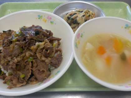 本日の献立:北雪牛丼、根菜汁、ほうれん草の彩り和え