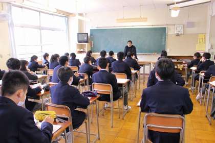 先生の話に聴き入る生徒たち・・
