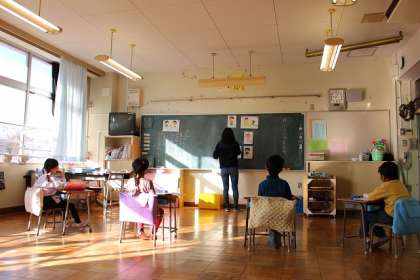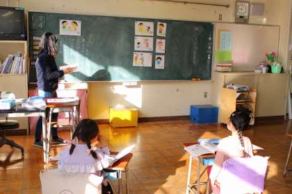 「みぶりでつたえる」さし絵を使いながら、どんな身ぶりなのか考えます。