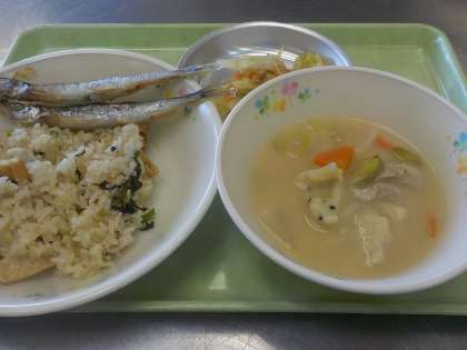 本日の献立:菜めし、焼きシシャモ、味噌すいとん、キャベツの生姜風味