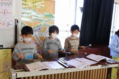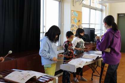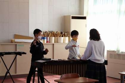 音楽づくり『ラドレで旋律づくり』木琴・鉄琴で・・。グループで練習です。