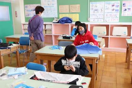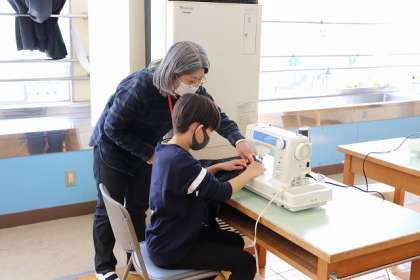 「ミシンにトライ!」エプロンづくりです。ボランティアの皆さん、ありがとうございます。
