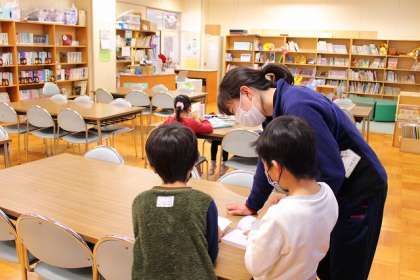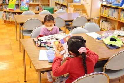 図書の時間です。本を読んだり、先生に漢字のお話をしたり、していました。