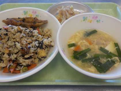 本日の献立:ひじきごはん、ワカサギの南蛮漬け。野菜のおかか和え、ニラ玉味噌汁