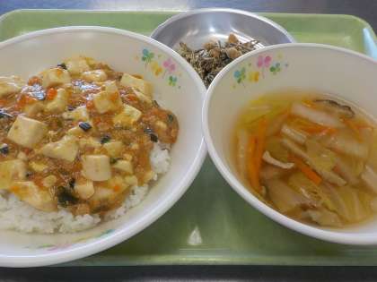 本日の献立:ごはん、マーボー豆腐、いりこと大豆の胡麻がらめ、白菜のスープ