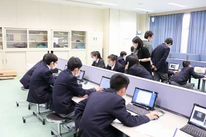 パソコン室にて「世界の国」調べ学習。発表に向けて、スライド作成しています。