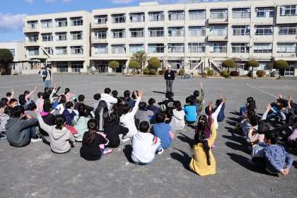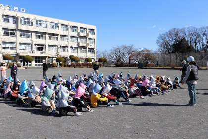 「授業中に、大きな地震が起きた」と想定して実施しました。放送により、地震の発生を知らせると、職員室の天井から同時に机の下に避難する音が瞬時に聞こえてきました。校庭に避難する態度もとても立派でした。