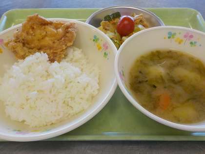 本日の献立:ごはん、鶏むね肉のから揚げ、ツナサラダ、ミニトマト、青さの味噌汁