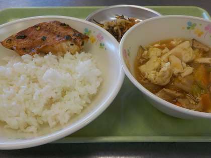本日の献立:ごはん、赤魚の薬味焼き、豆腐のうま煮、にんじんしりしり