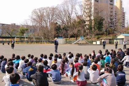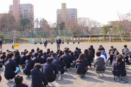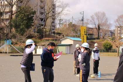 防災担当役の先生が報告を受けています。今年度の最後となる訓練です。「自分の身は自分で守る」ことを確認しました。