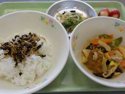 本日の献立:ごはん、ふりかけ、菜の花ともやしの和え物、生揚げと豚肉の味噌炒め、くだもの