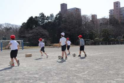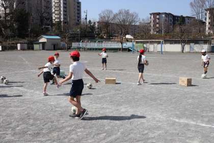 「ボールけりゲーム」ボールが段ボールの的に当たっているかな?