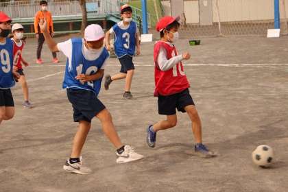 小さなコートでのサッカーゲームです。1チームは審判や計時を担当しています。