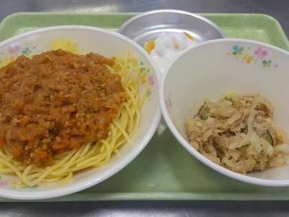 本日の献立:スパゲッティミートソース、大根ごまサラダ、みかんヨーグルト