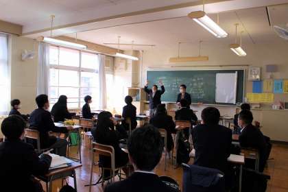 ジェスチャーで、形容詞の英単語を当てるゲームです。2つのチームに分かれています。