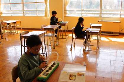 2つの教室に分かれて、鍵盤ハーモニカの練習をしています。