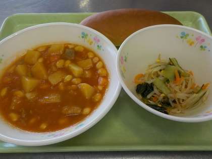 本日の献立:マーガリンパン、ポークビーンズ、小松菜とコーンのサラダ