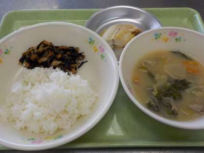今日の献立:ごはん、サバの塩焼き、豚汁、ひじきの炒め煮