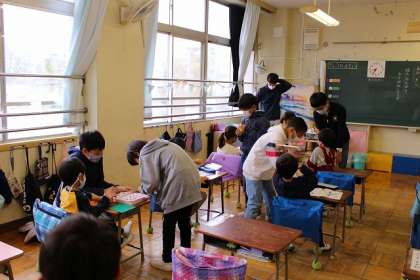 登校したら、教室に案内してくれる6年生。その後、おりがみを一緒に教えてくれました。
