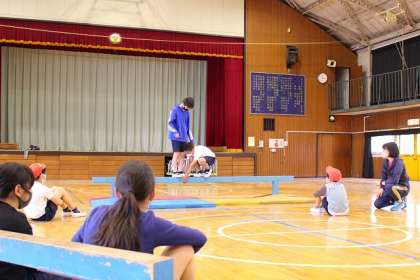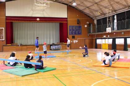 「体つくり運動」平均台を使って・・二人で反対方向に通りすぎることができるかな?