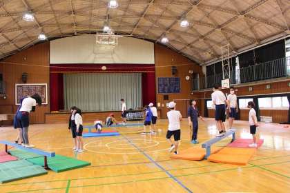 「体つくり運動」平均台を使って・・二人で反対方向に通りすぎることができるかな?