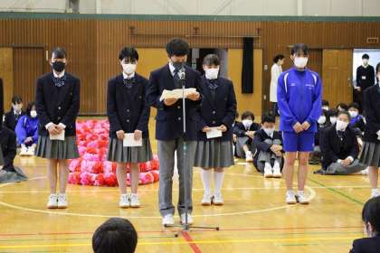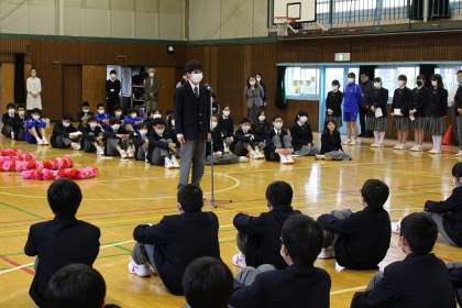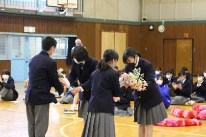 生徒会会長による歓迎の言葉、生徒会・委員会紹介、花のプレゼントと続きました。