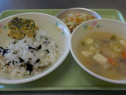 本日の献立:わかめご飯、厚焼き卵、味噌けんちん、野菜のおかか和え