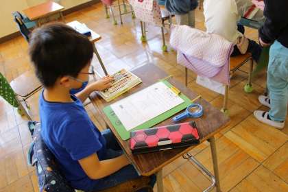 「生き物を探そう」校庭にて、春の生き物観察です。