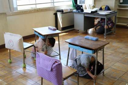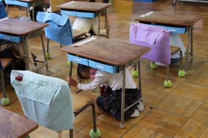 放送「訓練、地震が発生しました」の声に、小学部1年教室と2年教室では・・立派です。