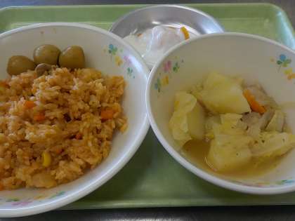 本日の献立:チキンライス、うずら卵のカレー煮、野菜のスープ煮、みかんヨーグルト