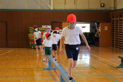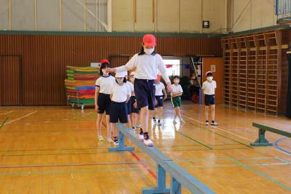 「体つくり運動」平均台を使って・・途中で1回転しながら歩きます。