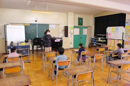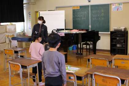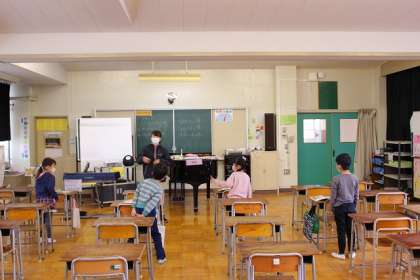 2つのチームに分かれて『かくれんぼ』の歌をうたっています。今日のポイントは、「強弱」です。