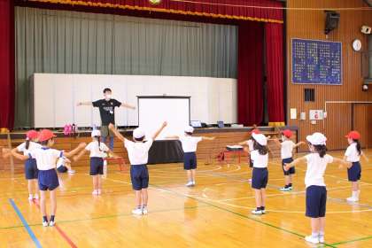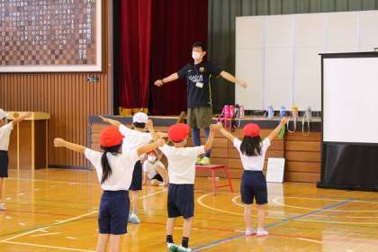 ラジオ体操の練習をしています。腕が伸びてきました。