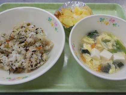 本日の献立:ひじきと豆のピラフ、たまごスープ、ポテトのチーズ焼き