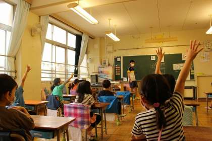 ひらがなの練習。たくさん手が挙がっています。