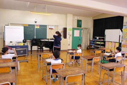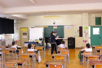 歌『はしの上で』2拍子に合わせてウッドブロックを演奏しています。