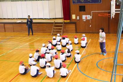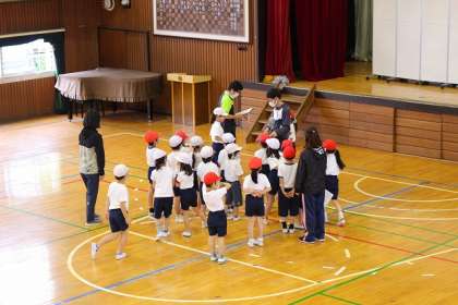 次は、徒競走の並び方の練習です。学年ごとに集合しています。
